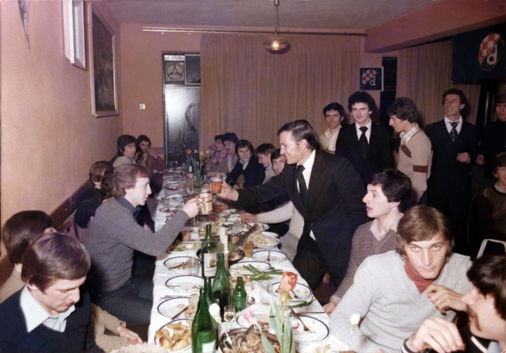 Ivan Zeljko Čolić nazdravlja s Velimirom Zajecom. Pored Čolića, u prvom planu, golman Tomislav Ivković, Snješko Cerin i prvi golman s brkovima Željko Stinčić.
