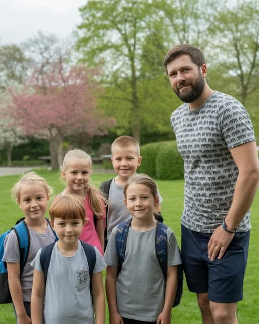 Deset godina kasnije Lucas je stajao ispred kuće, s gustom bradom i sijedim vlasima, noseći majicu s uzorkom životinja — jer su je blizanci obožavali. Petoro djece se smijalo, spremajući ruksake za godišnji izlet za koji je cijele godine štedio: